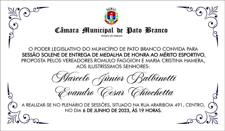- Entrega de "Medalha de Honra ao Mérito Esportivo” aos atletas, Senhores Marcelo Júnior Balbinotti e Evandro Chioquetta