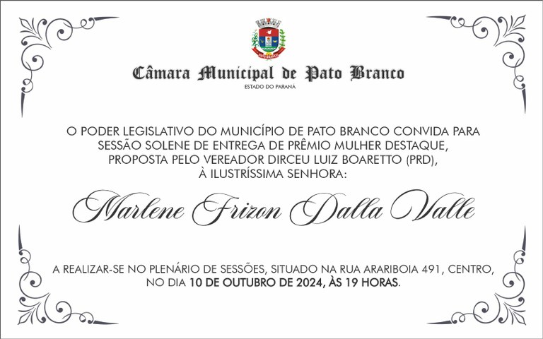 - Sessão Solene de entrega do “Mulher Destaque” à Senhora Marlene Frizon Dalla Valle.