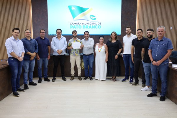 Em Sessão Ordinária realizada nesta segunda-feira (9), a Câmara Municipal de Pato Branco entregou Moção de Aplauso ao artista visual Rodrigo Piasecki. Os vereadores também iniciaram a tramitação de projetos de lei do Executivo e do Legislativo. A pauta contou ainda com a apresentação e aprovação de 30 requerimentos e de sete indicações.