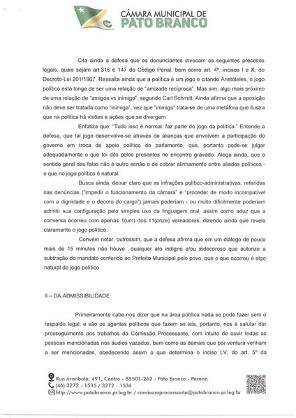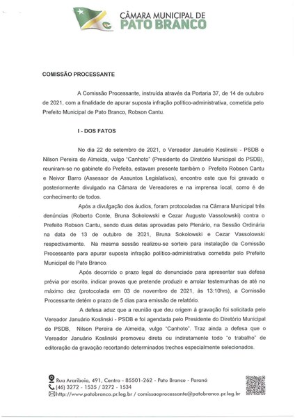 A Comissão Processante (CP) divulgou, após a reunião desta sexta-feira (5), o resultado do relatório aprovado por todos os membros da CP. De acordo com o presidente da Comissão, vereador Dirceu Boaretto (Podemos), após a análise da defesa apresentada, a Comissão decidiu pelo prosseguimento da apuração da suposta infração político-administrativa, cometida pelo prefeito de Pato Branco, Robson Cantu.